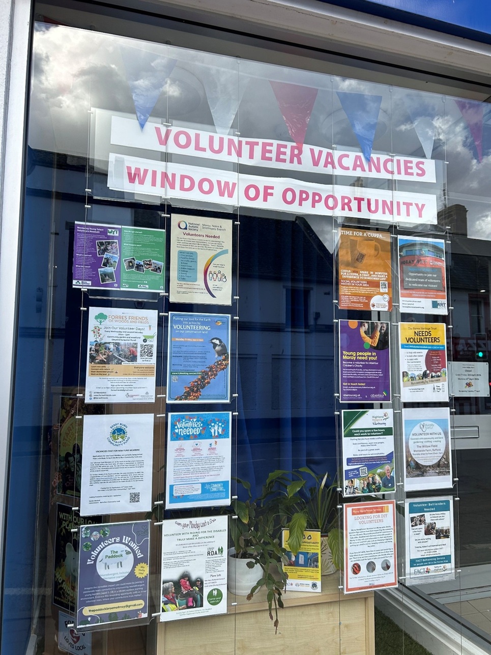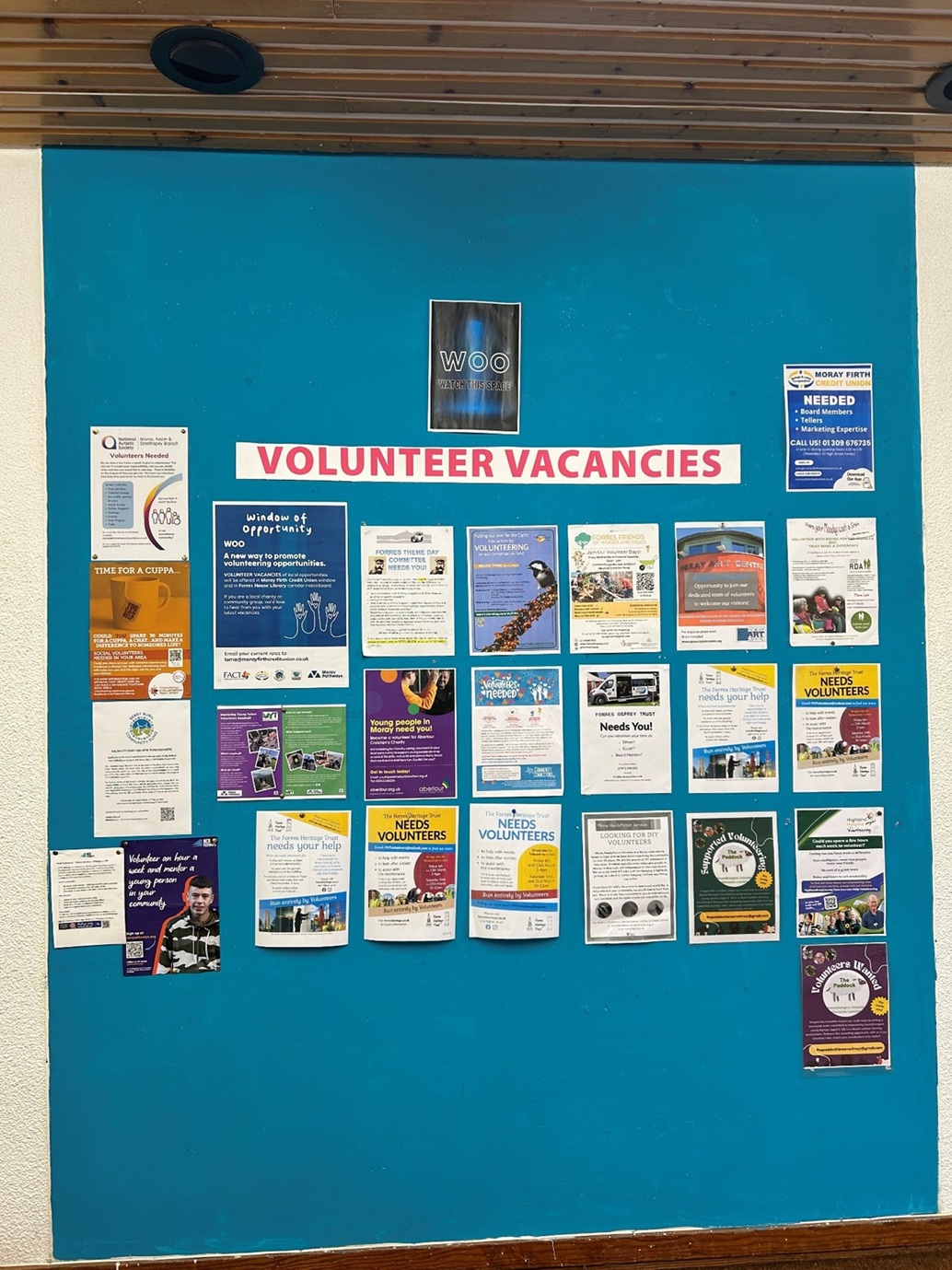 The Window Of Opportunity (WOO) project connects local people with volunteering opportunities via posters at the Forres House Library corridor and the Credit Union office window. The intention is for the project to eventually expand to other community spaces.